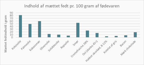 De fleste fedtholdige fødevarer indeholder en blanding af forskellige fedtsyrer, men mængden varierer. Olier som raps- og olivenolie har f.eks. et lavt indhold af mættet fedt, mens kokosolie næsten udelukkende består af mættede fedtsyrer. På figuren herunder kan du se eksempler på forskellige fødevarer, og hvor meget mættet fedt de indeholder.